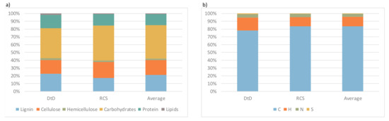 Ultimate (a) and bromatological (b) analyses for different collection systems (DtDS and RCS).