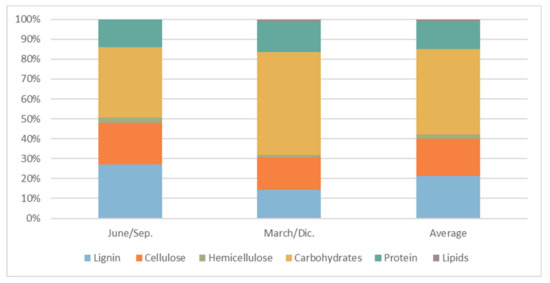 The results of the bromatological analysis were influenced by seasonality; in fact, the percentages of lignin and carbohydrates varied depending on the month of sampling (Figure 6). The prevalent components were the carbohydrates, lignin and cellulose equal to, respectively, 40.2 ± 9.1 %TVS, 30.7 ± 11 %TVS, 23.5 ± 0.2 %TVS in the warmer months and 49.0 ± 11 %TVS, 13.7 ± 5.6 %TVS, 15.2 ± 2.71%TVS in the colder months. A significant contribution of 15.17 ± 0.05 %TVS was also observed for the protein in the warm months and 14.2 ± 0.1 %TVS in the cold months. In the warm months, the contribution of garden waste reduces the carbohydrate content in favor of lignin. A low lipid content was also observed compared to that found by other authors [11,18,20], probably due to the fact that many authors study food waste (and therefore kitchen waste alone) while in this study OFMSW was studied in its entirety including garden, paper and undesirable waste fractions.