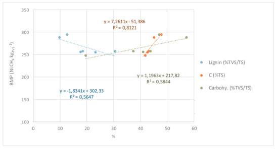 Linear correlation between BMP and carbohydrate, lignin and carbon (C) content.