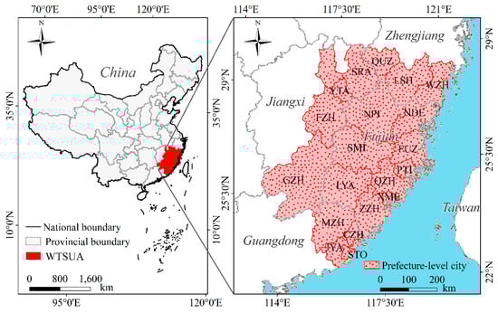 Location of the study area (WTSUA represents the West Taiwan Strait Urban Agglomeration, FUZ represents Fuzhou, XME represents Xiamen, PTI represents Putian, SMI represents Sanming, QZH represents Quanzhou, ZZH represents Zhangzhou, NPI represents Nanping, LYA represents Longyan, NDE represents Ningde, STO represents Shantou, JYA represents Jieyang, CZH represents Chaozhou, MZH represents Meizhou, WZH represents Wenzhou, LSH represents Lishui, QUZ represents Quzhou, FZH represents Fuzhou, SRA represents Shangrao, YTA represents Yingtan, GZH represents Ganzhou).