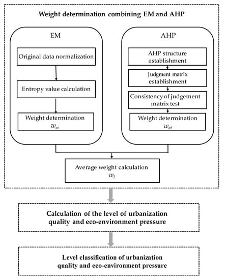 A combination of EM and AHP was used in this study to determine the weight of each indicator in the urbanization quality system and the eco-environment pressure system. EM is an objective weighting method that is not disproportionally influenced by experts’ subjective opinion [37]. For the objective weighting method, the EM is far more widely used than any of the other techniques [38,39,40]. EM determines the indicator’s weight based on the information size of each indicator by fully mining the information of the original data [41]. The greater the relative change in the indicator, the higher the weight [42]. Thus, the results have a strong theoretical and mathematical basis [43]. The AHP method, as a multi-objective decision analysis approach, quantifies expert empirical judgments to determine the index weights by combining quantitative and qualitative analysis, which has higher rationality [43,44,45,46]. Thus, combining the EM and AHP methods to determine the weight of each index can improve the accuracy of the weight and the credibility of the evaluation results. The flowchart of comprehensive evaluation combining EM and AHP was illustrated as Figure 2.