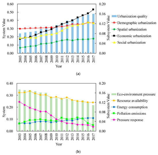 The dynamic changes of urbanization quality and eco-environment pressure and the levels of their subsystems from 2003 to 2017. (a) The dynamic changes of the level of urbanization quality and four subsystems from 2003 to 2017; (b) The dynamic changes of the level of eco-environment pressure and four subsystems from 2003 to 2017.