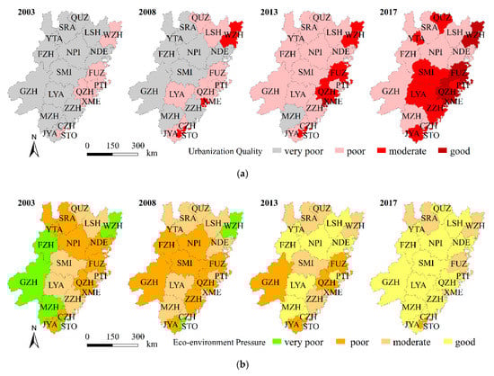 To clearly describe the spatial distribution characteristics of urbanization quality and eco-environment pressure within each dimension in the WTSUA, an equal interval method was adopted to analyze the level of urbanization quality and eco-environment pressure in 20 prefecture-level cities in this study. Specifically, the value of urbanization quality was divided into 0.118–0.280, 0.281–0.443, 0.444–0.606, and 0.607–0.770, which correspond to the level of very poor, poor, moderate, and good, respectively [49,50,51]. The value of eco-environment pressure was divided into 0.158–0.236, 0.237–0.315, 0.316–0.394, and 0.395–0.473, which correspond to the level of good, moderate, poor, and very poor, respectively.