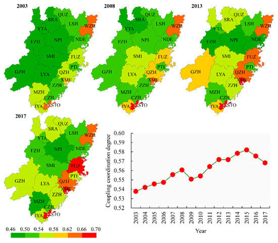 Figure 5 illustrates the coupling coordination degree between urbanization quality and eco-environment pressure in spatial and temporal dimensions. It was found that the coupling coordination degree between urbanization quality and eco-environment pressure presented a general increase during the study period, which indicated that eco-environment pressure was decreasing with the continuous improvement urbanization quality.