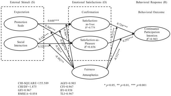 We employed AMOS to test the hypotheses proposed in Section 3. Figure 2 shows the results of the structural model, including the standardized path coefficients, significance, and variance explained (R2). The overall fit indices for the model are acceptable as they are within the commonly accepted values. Chi-square/df is , RMSEA is , GFI is , IFI is , TLI is , AGFI is , and CFI is . The calculating results show that the path coefficients are all significant. The results indicate that promotion scale has a significantly positive effect on satisfaction-as-trust (H1: , ) and satisfaction-as-pleasure (H2: , ). Therefore, H1 and H2 are accepted. Social interaction has a significantly positive effect on satisfaction-as-trust (H3: , ) and satisfaction-as-pleasure (H4: , ). Thus, H3 and H4 are accepted, too. In addition, the results indicate that satisfaction-as-trust has a significantly positive effect on repeat participation intention (H5: , ). Satisfaction-as-pleasure has a significantly positive effect on repeat participation intention (H6: , ). Thus, H5 and H6 are accepted.