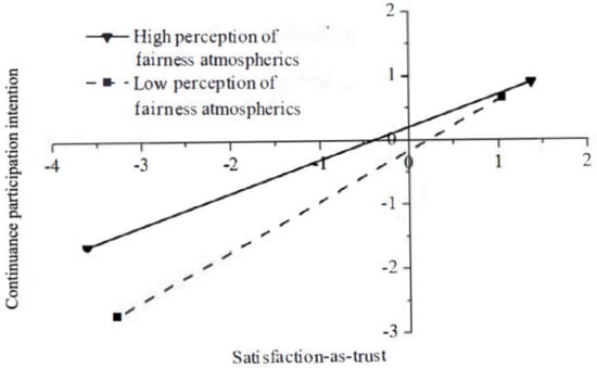 Fairness atmospherics moderate the relationship between participant satisfaction judgment as trust and continuance participation intention.