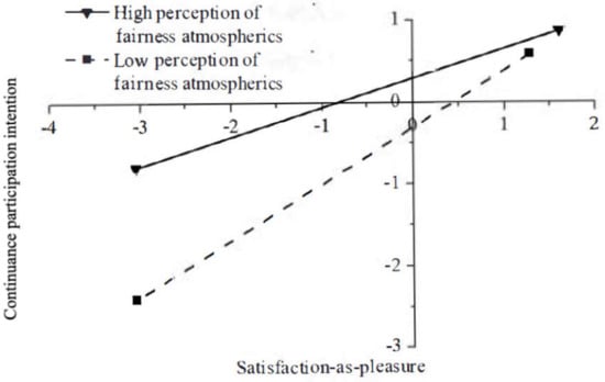 Fairness atmospherics moderate the relationship between participant satisfaction judgment as pleasure and continuance participation intention.