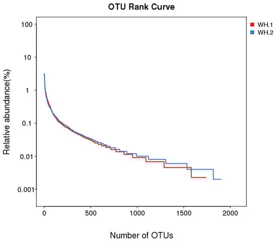 The similar coverage index in both WH.1 and WH.2 suggested the accuracy of this analysis. Sobs denoted the number of observed species in the wasp nests. The values obtained from Chao1 represented the community richness and estimated the total number of microbes, while the Shannon and Simpson indices represented the community diversity found in the wasp nests. The Sobs, Chao1 and Shannon indices of WH.1 were less than those of WH.2, suggesting a higher bacterial diversity associated with the V. vulgaris nest located in a natural environment of a small forest area. The number of OTUs corresponding to relative bacterial abundances is presented in Figure 2 and is in agreement with data obtained under Table 2.