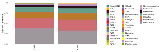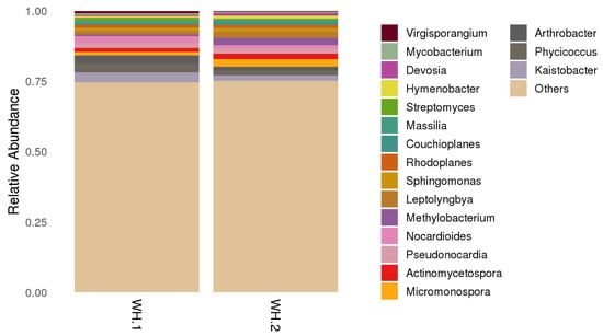The overall distribution of phyla showing predominance of bacterial OTUs belonging to Actinobacteria followed by Proteobacteria in the wasp nests is shown in Figure 3. Though Actinobacteria and Proteobacteria dominated in both WH.1 and WH.2, the latter showed a relatively greater bacterial diversity for those phyla. This variation could be due to different habitats (WH.1 was located in an apartment in a residential campus, while WH.2 in a small forest far from the residential area). The ecological environment of the forest area can be helpful in providing higher bacterial diversity.