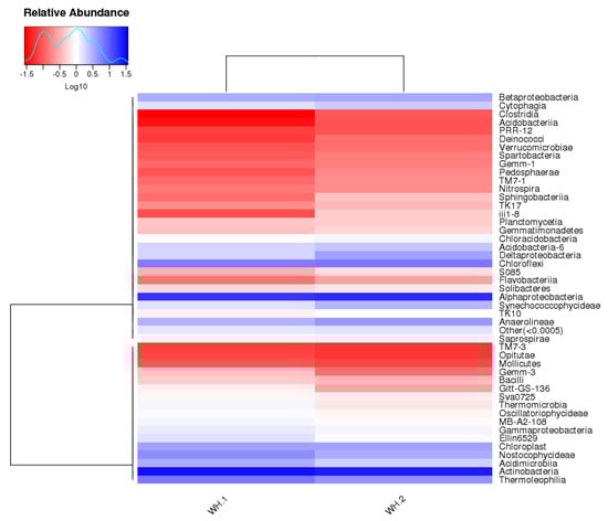 In order to understand and find out if any differences existed between WH.1 and WH.2, the heatmap of bacterial abundance at class level is displayed in Figure 4. It shows a similar trend in terms of bacterial diversity, where the abundant classes were of Actinobacteria and Alphaproteobacteria, followed by Chloroflexi, Thermoleophilia and Anaerolineae. Kaistobacter, Phycicoccus, Arthrobacter, Micromonospora, Actinomycetospora, Pseudonocardia, Nocardioides, Methylobacterium and Leptolyngbya were major genera present in the wasp nests (Figure 5).