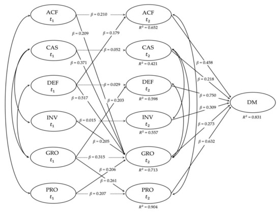 Final cross-lagged model results. Note: β: coefficient; : coefficient of determination; ACF: access to finance; CAS: cash; DEF: debt financing; INV: inventory; GRO: growth; PRO: profitability; MD: decision-making.