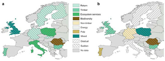 Objects of strength of expected values among forest professionals. Base map modified from GISCO–Eurostat (European Commission) with Administrative boundaries: © EuroGeographics © Food and Agriculture Organization of the United Nations © Turkstat. Objects with (a) maximum negative and (b) maximum positive absolute strength of expected values in each country.