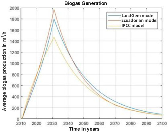 Figure 1 shows that both the LandGem and Ecuadorian models attain similar results. The differences between these models are the values of constants K and L0. This variation occurs because in the LandGem model, it is necessary to calculate these parameters, but in the Ecuadorian model, they are already provided by default. The Ecuadorian model produces higher values, obtaining a maximum generation of 1971 m3/h in 2031. The LandGem model, on the other hand, produced lower values, obtaining a maximum of 1799 m3/h in 2031. The IPCC model, unlike the Ecuadorian and LandGem models, exhibited atypical behavior: Of the three models analyzed, it estimated the lowest biogas percentage, with a maximum biogas generation of 1469 m3/h in 2031.
