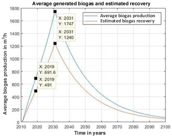 For the calculation of the biogas potential, the suggestion is to average the three values obtained by the models. The data obtained on the average biogas production and the estimated usable biogas are shown in Figure 2. This chart shows the biogas production of the landfill and the biogas recovered based on the proposed recovery efficiency. The figure reveals that the biogas generation rate is zero in 2010 (the initial year of waste deposition); subsequently, it increases exponentially until 2031, after closure. It is evident that in 2031, the landfill would reach a maximum biogas generation of 1240 m3/h, after which it begins to decay.