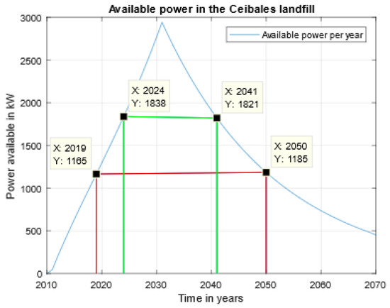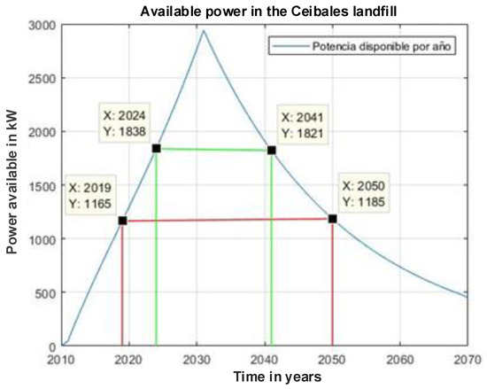 Figure 3 shows the power availability in the Ceibales landfill and indicates that in 2019, a 1 MW generator could be installed, and this amount of power will be available until 2050. The red line represents the 1 MW generator and the years during which this power would be produced. In 2023, a second 800 kW generator could be installed, and this amount of power would be available until 2041. Similarly, the green line represents an additional 800 kW generator, as well as the time that this amount of power will be available.
