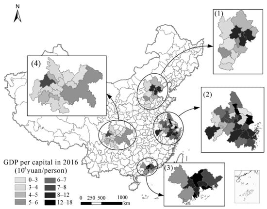 Economic development of the four major urban agglomerations. Note: (1) the Beijing-Tianjin-Hebei (BTH), (2) the Yangtze River Delta (YRD), (3) the Pearl River Delta (PRD), and (4) the Chengdu-Chongqing (CY) urban agglomerations.