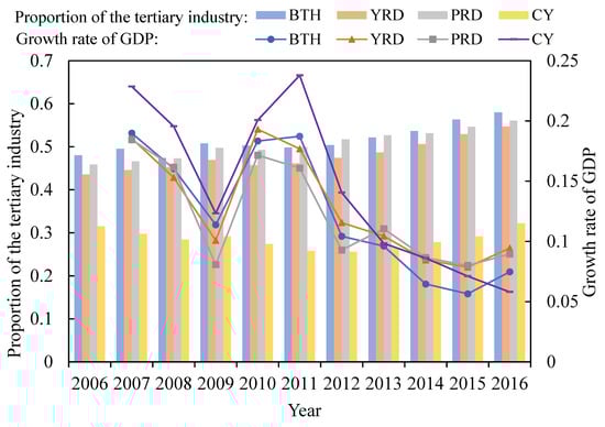 Trends in economic growth and the proportion of tertiary industries in the four major urban agglomerations from 2006 to 2016.