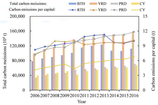 Total carbon emissions and per capita carbon emissions in urban agglomerations from 2010 to 2016.