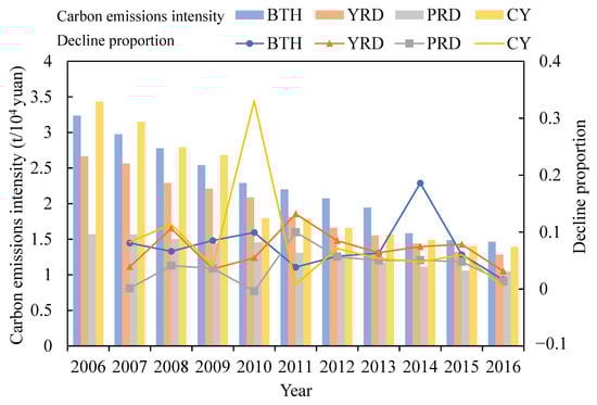 Carbon intensity of the four major urban agglomerations from 2006 to 2016.