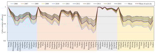 This paper used data from 2006, 2011, and 2016 to represent the difference in carbon emission efficiency between various urban agglomerations (Figure 6). We compared the overall carbon emission efficiency status of urban agglomerations in the same period. For 2006, 2011, and 2016, the carbon emission efficiency of the four major urban agglomerations were ranked as follows: Pearl River Delta > Beijing-Tianjin-Hebei > Yangtze River Delta > Chengdu-Chongqing. The Beijing-Tianjin-Hebei urban agglomeration included Beijing and Tianjin as high-value centers for carbon emission efficiency and generally exhibited the characteristics of high carbon emission efficiency in the south and low carbon emission efficiency in the north. The carbon emission efficiency of Zhangjiakou, Chengde, and Xingtai increased by more than 0.10, and the carbon emission efficiency difference between Zhangjiakou, Chengde, and Xingtai and Beijing decreased from 0.1275, 0.1980 and 0.1911 in 2006 to 0.0638, 0.1012, and 0.0975 in 2016. The carbon emission efficiency of the Yangtze River Delta urban agglomeration presented characteristics of high carbon emission efficiency in the east and low carbon emission efficiency in the west. The cities with higher internal carbon emission efficiency were more dispersed, and the potential for increasing the carbon emission efficiency of western cities was higher than that of the east. The overall carbon emission efficiency was relatively high, and the internal gap was small. In 2016, the carbon emission efficiency of all nine cities exceeded 0.95, which was a small increase compared with 2006. Chongqing was the center with the highest carbon emission efficiency for Chengdu-Chongqing, and its carbon emission efficiency was significantly higher than other cities. Compared with other cities, the carbon emission efficiency of Ya’an had increased significantly. The main reason was that Hebei Province, in accordance with the Beijing-Tianjin-Hebei Regional Environmental Protection Initiative to Break Through the Cooperation Framework Agreement, adopted measures to reduce coal pressure, reduce loose coal, and control oil quality to promote carbon emission efficiency. However, resource allocation is not balanced in the Beijing-Tianjin-Hebei urban agglomeration region, industrial dependence among cities is low, and Beijing and Tianjin have an obvious industrial agglomeration effect, which can attract investors and entrepreneurs, and form clusters of high-tech and innovative industries, leading to significantly higher carbon emission efficiency than that of the surrounding cities. In terms of resource agglomeration, the municipalities can provide investors and entrepreneurs with a better platform to attract skilled workers to gather in Beijing and Tianjin, forming a siphon effect in the surrounding areas and concentrating the various resources from the surrounding cities in the central cities. The Yangtze River Delta urban agglomeration has developed light industry, with a reasonable industrial structure, equipped with high-end industries, and the central cities (Shanghai, Hangzhou, Nanjing) cooperate closely with surrounding cities. The resources, technology, and capital of the central cities spread outward, driving development in the surrounding cities. The economic development level and the overall carbon emission efficiency in the Pearl River Delta region are high due to decentralization; the economy is well developed, the economic structure is reasonable, the industry is high-end, with high level manufacturing services, and high carbon emission efficiency. The Chengdu-Chongqing urban agglomeration hosts many defense technology companies using steel, automobiles, coal power, chemical and other industries as their leading industries. Except for the automobile, motorcycle manufacturing, and some equipment manufacturing industries, other industries have developed independently in each city, and industrial scale efficiencies and clusters have not formed. As a result, inter-city industries are not sufficiently coordinated, and their relative carbon emission efficiency is low.