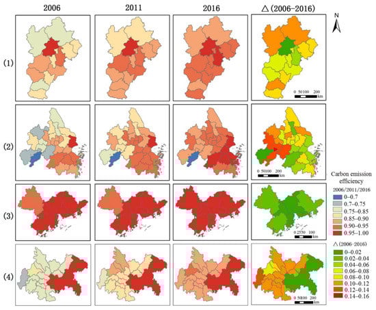 Spatial changes in carbon emission efficiency of the four urban agglomerations. Note: (1) the Beijing-Tianjin-Hebei, (2) the Yangtze River Delta, (3) the Pearl River Delta, and (4) the Chengdu-Chongqing urban agglomerations.