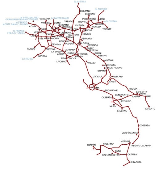 Sections of the Italian motorway network for which data are available until the end of 2018 (adapted from [14]).