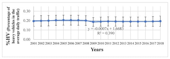 Based on the figures reported above, it is possible to note that the percentage of heavy vehicles in the average daily traffic (%HV) was fairly stable over the years from 2001 to 2018. The average %HV was close to 20%. Considering the standard errors reported in Figure 3 for each year, it can be stated that in almost 70% of motorways sections, %HV varies between approximately 15% and 25%.
