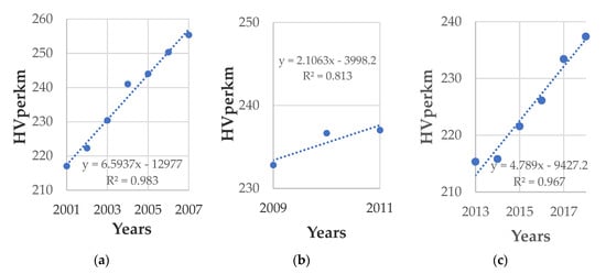Local HVperkm increasing trends in the periods: (a) 2001–2007, (b) 2009–2011, (c) 2013–2018.