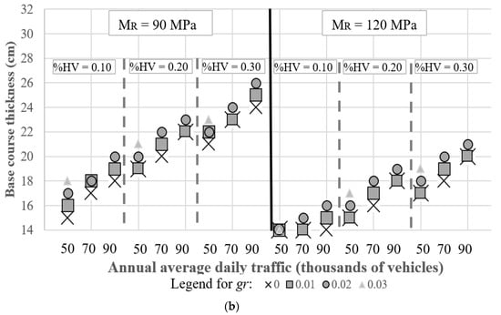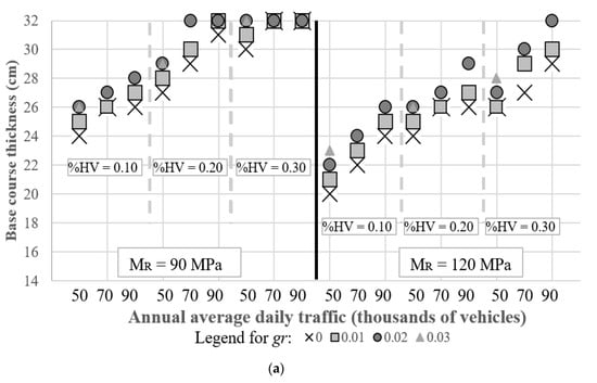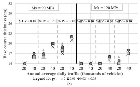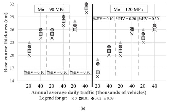 Apart from trivial remarks on the variability of the layer thickness with the initial traffic volume, the share of heavy vehicles (resulting in thickness increasing) and the resilient modulus of the subgrade (resulting in thickness decreasing), there is an evident influence of the heavy vehicle growth rate. In fact, depending on the considered combination of variables, it may result in a thickness variation of 1 to 4 cm between zero growth rate and the maximum considered rate (3%). This is less evident when considering results from the KENLAYER simulations, but minimum required thicknesses are smaller in that case and so their variability is smaller as well. The significant influence of the traffic growth rate can be noted for different resilient moduli, different traffic volumes, and percentages of heavy vehicles. In several cases, even a 1% gr increase is related to thickness increasing, resulting in a significant overall increase in the total heavy vehicle passages. In some limited cases, once the maximum thickness of the base course is reached (32 cm, according to [15]), the subgrade course thickness is also increased under the different growth rates with respect to the standard constant thickness of 15 cm [15], such as in the case of: MR = 90 MPa, %HV = 20–30% (Figure 7a).