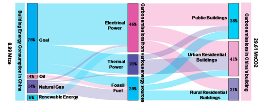 Energy flows in the Chinese residential building sector (2016). Note: Coal is the main source of energy in China, accounting for 76% of energy consumption. In the secondary energy (e.g., electric and thermal power), the carbon emission of electric power is the largest, accounting for 46%, the carbon emission of heating in the northern region accounts for 25%, and the carbon emission of fossil fuels such as coal and natural gas accounts for 29%. The energy consumption and carbon emission of urban residential buildings (URBCE) are the largest, accounting for 41%, i.e., exceeded 1.2 billion tons. Data source: National Bureau of Statistics of PR China (http://data.stats.gov.cn/english/).