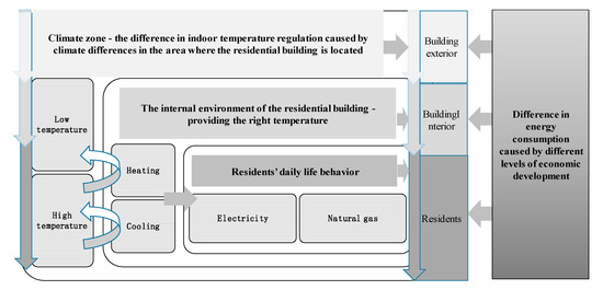 This study studies the influencing factors of URBCE intensity in 30 regions in China (Appendix A). Most of the research on the factors that affect the URBCE is concentrated on the carbon emissions of the entire country or a single area. Research on the spatial difference of carbon emission panel data for URB is limited. In comparison with the carbon emissions of the industry and the construction industry, those of the URBCE have distinct characteristics. Residential buildings are crucial for people’s daily life. Their main function is to provide a suitable living environment to meet the daily basic needs of people. Therefore, carbon from residential buildings are emitted to shape a suitable living environment and maintain the energy consumed in people’s daily life (Figure 4).