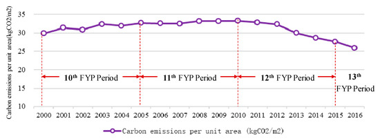 Figure 6 shows that the carbon emissions per unit area of URBs can be roughly divided into two stages. During 2000–2010, the carbon emissions per unit area of the URBs showed a small fluctuation, which was basically maintained at approximately 32.14 kg CO2/m2, of which the maximum value during the observation period in 2010 was 33.22 kg CO2/m2. In 2010–2016, the carbon emissions per unit area of the URBs showed a continuous downward trend. By 2016, this value fell to the minimum during the observation period at 25.89 kg CO2/m2, which was 22% lower than that in 2010. The annual growth rate of carbon emissions per unit area of the URBs was −0.89%; that is, the carbon emissions per unit area of the URBs were weakened entirely. In 2001 and 2003, the growth rates were the largest (approximately 5%). In 2013 and 2016, the decline rate was the largest (approximately 6.8%).