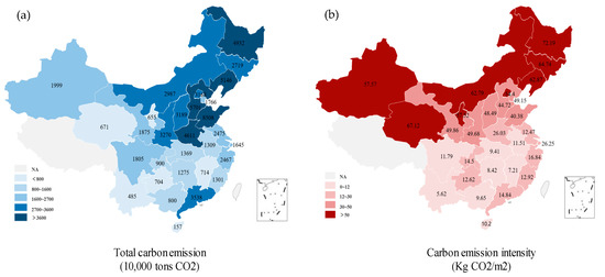 LC (the total URBCE) and intensity of urban residential buildings (URBs) in 2016. (a) Total carbon emissions (10,000 tons CO2); (b) Carbon emissions intensity (kg CO2/m2).