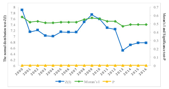 The GI of URBCE intensity in the 30 regions of China from 2000 to 2016 was calculated using the software ArcGIS, and its significance was tested by constructing a normal distribution by the random permutation method. The results are shown in Figure 8.