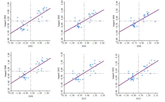 The GI scatterplot can reflect the degrees of association and correlation among local regions but not the significance of the degree of association in local regions [46]. Therefore, this research uses a combination of GI scatterplots and Local Indicators of Spatial Association (LISA) cluster plots to analyze the spatiotemporal pattern evolution of URBCE intensity in the 30 regions of China from 2000 to 2016. Quadrants 1 and 3 and 2 and 4 of the GI scatterplot represent the positive and negative spatial correlation between samples, respectively. The first, second, third, and fourth quadrants indicate that the area with high, low, low, and high observation values are surrounded by a high-value agglomeration area (HH), high-value area (LH), low-value area (LL), and low-value area (HL), respectively [41]. LISA agglomeration maps represent different spatial autocorrelation types by using various colors and can reflect the significance of the degree of correlation in local areas.