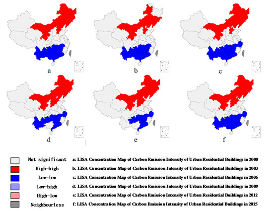 Figure 8 shows the remarkable spatial autocorrelation characteristics of URBCE intensity in the 30 regions from 2000 to 2016. The GI of URBCE intensity in China was always approximately 0.5 during the study period, and its positive statistics Z(I) passed the 1% significance test. The GI declined slightly from 2000 (0.58) to 2004 (0.51), indicating that the spatial concentration of LCI was decreasing during this period. In 2005–2009, the GI showed an upward trend; it was 0.57 in 2009, showing that the spatial concentration of LCI increased during this period. In 2009–2013, the GI reduced significantly, indicating that the spatial agglomeration characteristics of URB LCI decreased significantly in this stage. In 2013–2016, the GI was constant at 0.49, and the spatial autocorrelation of LCI in the URBs in this stage was stable. Overall, the spatial autocorrelation of carbon emission intensity of the residential buildings in the 30 urban areas in China presented a variation of local fluctuations and a small overall decline, but the overall spatial autocorrelation was strong [41].