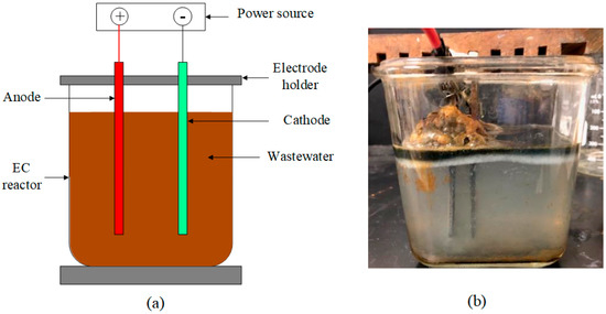 Electrocoagulation (EC) is an emerging technology for the removal of solid particles and other contaminants from high-strength wastewater (e.g., pulp and paper wastewater, animal wastes, leachate, and industrial wastewater) [5,6,7]. It has been studied by numerous research groups to remove metals [8,9], organic matters [10,11,12], nutrients [13], and microorganisms [14,15] from a variety of wastewaters. Compared to the conventional coagulation–flocculation process, EC has several advantages, such as in situ coagulant production induced by dissolving metal using electric current, combination of three processes (coagulation, flocculation, settling) in a single step, shorter reaction/retention time, and removal of small particles and color-causing compounds [9,10,16].