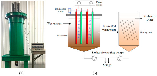 The EC treatment system. (a). 60 L pilot-scale EC unit; (b). The diagram of the EC treatment system *. *: the inclining baffles in the setting tank is to facilitate the gravity settling of small particles in the EC-treated wastewater.