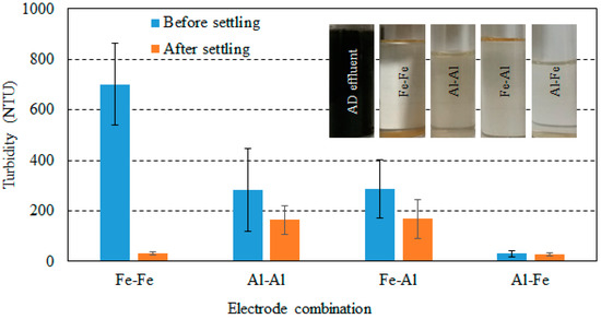 The turbidity in liquid phase at the end of EC and after 10 min gravitational settling *. The tests were run 3 times, and results are the average of three tests. Error bars indicate standard deviation from the average value. *: The picture on the top right side was the reclaimed water after 10 min settling from different electrode combinations with the comparison of the original anaerobic digestion (AD) effluent.