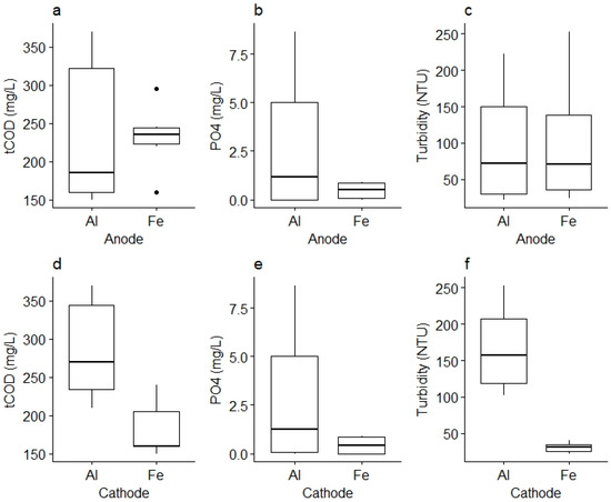 Effects of different electrodes on the EC performance of total chemical oxygen demand (tCOD), total phosphorus (TP) as PO4, and turbidity removal. (a). Anode on tCOD; (b). Anode on PO4; (c). Anode on turbidity; (d). Cathode on tCOD; (e). Cathode on PO4; (f). Cathode on turbidity.