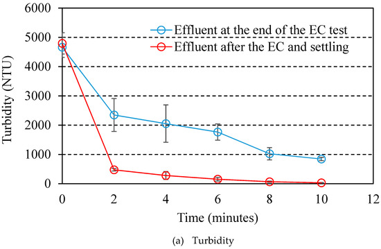 Electrocoagulation using the Fe–Fe electrode combination was studied to elucidate its effects on water quality of the reclaimed water during the treatment process. The results showed that turbidity was quickly removed by 90% in the first 2 minutes and then leveled off for the rest of the EC (Figure 5a). This phenomenon could be attributed to the characteristics of the AD effluent. The effluent contains big solid particles, cell flocs, and small suspended solids. Surface charge of the big solid particles and cell flocs with a small surface area is relatively less stable and much easier to be neutralized by a small amount of metal coagulants from the EC reaction [18]. This would be the reason the turbidity of the solution was quickly removed at the beginning of the EC. With the progress of removing big solid particles and cell flocs, small particles (with a much bigger surface area) in the solution demand more coagulants to form flocs and settle down, which took a longer time to be removed. Small suspended particles in the effluent also contributed to the dark color of the solution. As a result, with removing the small particles, the treated effluent started becoming clear. In addition, the settling step clearly demonstrated the benefit on removing the particles and significantly (P < 0.05) improved the quality of the reclaimed water. At the end of the EC treatment (with both EC and settling), 99.4% of the original turbidity had been removed. A reclaimed water was obtained with a turbidity of 32 NTU (Figure 5a).
