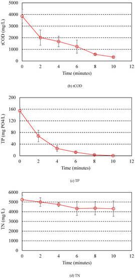 Changes of tCOD, TN, and TP during the treatment process (after the settling) were measured as well (Figure 5b–d). Similar to the trend of turbidity changes, the tCOD and TP of the treated solution exponentially decreased. The tCOD and TP of the reclaimed water were 336.7 mg/L and 0.5 mg PO4/L, respectively. The corresponding removal of tCOD and TP was 99.2% and 99.8%. However, TN removal was insignificant during treatment (Figure 5d), which is similar to a previous study [9]. Nitrogen-based compounds in the effluent include ammonia, nitrate, and nitrite. Due to the strong electronegativity of nitrogen in these compounds, they are very hydrophilic. EC technology is not able to remove them. An electrooxidation process using boron doped diamond (BDD) electrodes was designed and applied to oxidize the nitrogen compounds and remove the TN in the reclaimed water (the results are presented in the Supplementary Materials).
