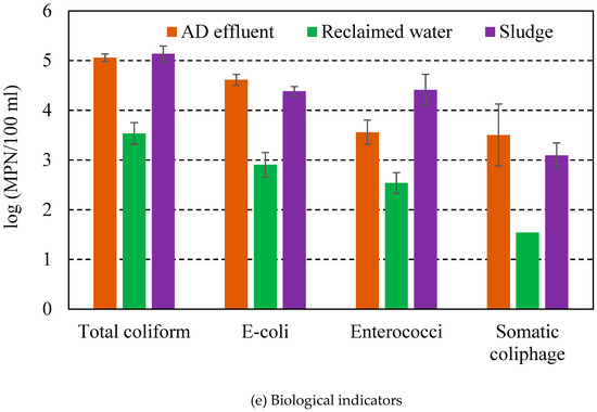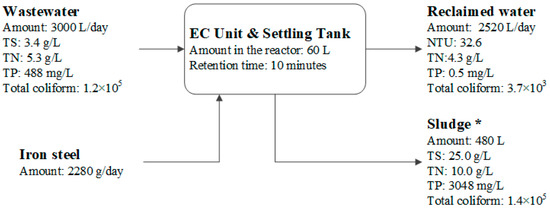 With the water recovery of 84%, the mass balance concluded that the treatment consumed 2.3 kg/day of iron electrodes to reclaim 2520 L/day water with reduced nutrients and biological indicators and generate 480 L of the sludge with elevated nutrient contents of 10 g/L TN (40% of TS) and 3.0 g/L TP (12% of TS) (Figure 6). Compared to solid digestate directly from liquid–solid separation of anaerobic digestion effluent that usually contains TN of 3–14% TS and TP of 0.6–1.7% TS [32], the sludge from the EC has a much better nutrient profile. In addition, since the pH of the sludge is above 7, iron in the sludge is in the form of iron oxides that have a limited impact on soil quality, which alleviates the concern of high iron content in the sludge. These results clearly indicated that regarding chemical composition, sludge is a good fertilizer. However, high contents of bacterial and viral indicators in the sludge (Figure 5) require a post-treatment to remove pathogens in order to be able to extensively apply for a wide variety of crops, vegetables, and fruits.