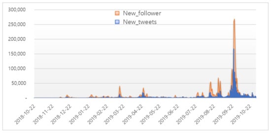 Trend of followers and tweets, October 2018–October 2019. Note: The data from August to September 2018 were so few in number that they were omitted from the analysis.