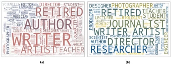 Figure 6 presents that users’ occupational statuses were similar for the two countries. The most common occupations extracted from the user description for both countries were author, writer and journalist. In addition, those with jobs requiring expressiveness skills, such as artist, photographer, producer and designer were also noticeable in the dataset. Moreover, “retired” was found to provide quite a large portion of the user base. We may thus infer that a relatively large portion of Twitter’s users are older than college students [10].