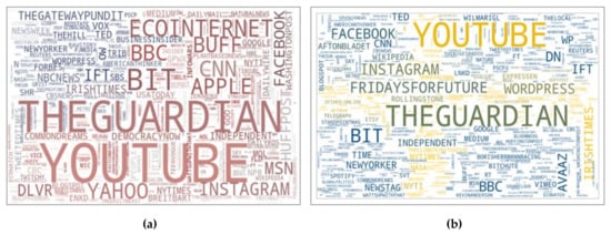 In total, 27.4% of tweets had URLs directing readers to the source of the information, such as news websites. As shown in Figure 7, the main link targets for US users were “The Guardian,” “YouTube,” and “EcoInternet”; for Swedish users, they were quite similar, but “EcoInternet” was replaced by the “FridaysForFuture” website. One interesting aspect about the sources is that the most frequent target of the links of the two countries’ users was “The Guardian.” This is not that surprising, because The Guardian is one of the major news platforms and has a wide reach. It is also possible that The Guardian was taking advantage of the controversy generated around Thunberg. In any case, what is interesting is that users were promoting the opinions of only one (or a few) media rather than diverse news media. Future studies are needed to explore the means by which users decide on the source of information.