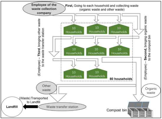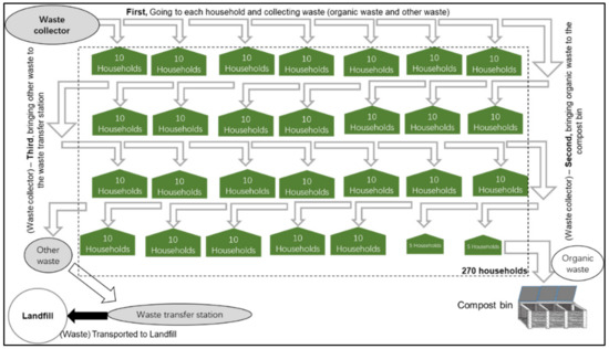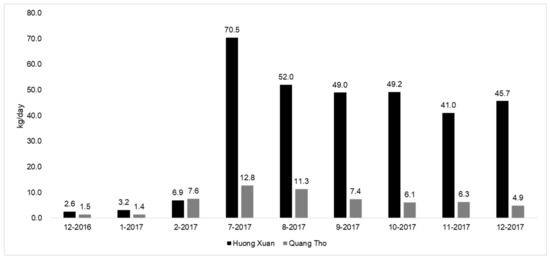 Two periods were implemented in the CCP because of changes in the scheme underlying the waste collection system in Huong Xuan and the expansion of the number of participating households in Quang Tho. In Huong Xuan, an employee of the waste collection company collected the organic waste for the compost bin as well as the other waste for the waste transfer station during the first period that ran from December 2016 to June 2017 (see Figure 5). Then, the local authority appointed Mr. D (a Huong Xuan resident), with his consent, as an organic waste collector for July to December 2017 (see Figure 6). This time period was the second period of the CCP.