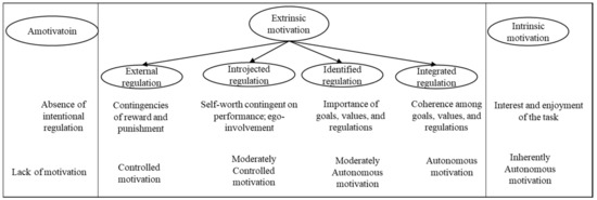 SDT is a broad meta-theory that suggests people are inherently motivated to perform a given behavior [55,56]. It covers the encouragement of individuals to actively engage with the surrounding environment with which individuals have an interactive relationship [57]. SDT states that motivation is a multidimensional concept that resides along a continuum (see Figure 9), and that the form of amotivation or a general lack of initiative and the absence of self-determination is a state of non-existent intentional regulation. Next in the continuum are external regulation and introjected regulation, which refer to stimulating performance through rewards, punishment, or external forces. These forms are seen as equivalent to controlled motivation. “Being controlled involves acting with a sense of pressure, a sense of having to engage in the actions” [36]. Then, the form of autonomous motivation is reflected by the interest and enjoyment exhibited by individuals as they engage in behaviors or deal with goals, values, and regulations. This form involves the endorsement of individual actions [36]. SDT assumes that the key point driving the action or behavioral performance of individuals is motivation, indicating that people find pleasure in conquering their social environment and are naturally self-motivated to do so [56,58].
