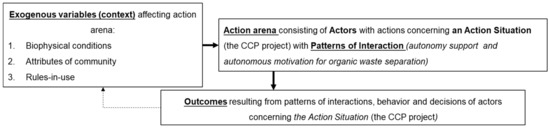 To take into consideration the context in which the waste management project in question was implemented, the present study included actors’ roles, actions associated with waste management, and their outcomes. An institutional approach was applied based on Ostrom’s institutional analysis and development (IAD) framework [37], which constituted a unique tool used systematically in this case study. Various investigations of waste management policy have previously applied the IAD framework [38,39,40,41]. In IAD analysis, interactions among actors are emphasized, especially how the results of individuals’ actions influence outcomes [38,40]. In addition, the IAD framework provides ways to analyze, measure, and understand an action’s impact as “exogenous variables [that] affect the structure of an action arena, generating interactions that produce outcomes” [42].
