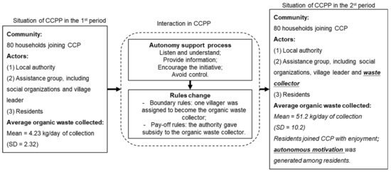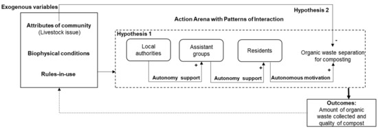 Exogenous variables create the environment that surrounds the actors, and this context might influence their reflection regarding their behavior. These variables enable the actors to ponder on the background in which they are situated. In this study, the support that the local authorities provided to the residents via the assistance groups was the factor that motivated the actors to exercise organic waste separation for composting and contribute to achieving the target collection of organic waste (amount collected). This kind of support was autonomy support that influenced autonomous motivation, which then generated the desired outcomes [36,59,60,61]. Over time, the CCP outcomes affected changes in the rules-in-use (modifications to the scheme of the waste collection system and the expansion of the number of households), thereby paving the way for deriving better outcomes in the future. An adapted IAD framework was established to analyze the CCP and realize the research objectives. Figure 10 illustrates the incorporation of the aforementioned concepts into the adapted framework.